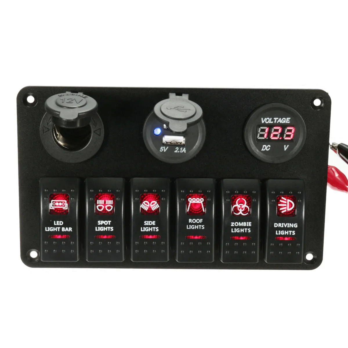 2 USB Socket 6 Gang Red LED Rocker Switch Cigarette Plug Voltage Panel Marine Boat RV